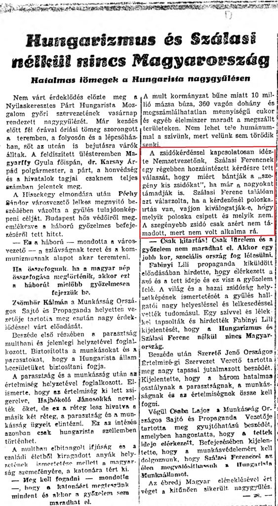 A legszimplább tények figyelembevételét sem igényelte senki a propagandától, például, hogy az országban ekkor már alig akadhattak zsidók, hiszen ’44 nyarán deportálták a vidéken élőket, ősszel a pesti gettót is felszámolták. De a dehumanizálás a mindennapi szókészlet része volt, és ahhoz, hogy a társadalom egy jelentős része elfogadja a népirtást, két fő teendője volt a szócsőként működő Győri Nemzeti Hírlapnak, amely nap mint nap hangszóróként erősítette fel a hivatalos narratívát: