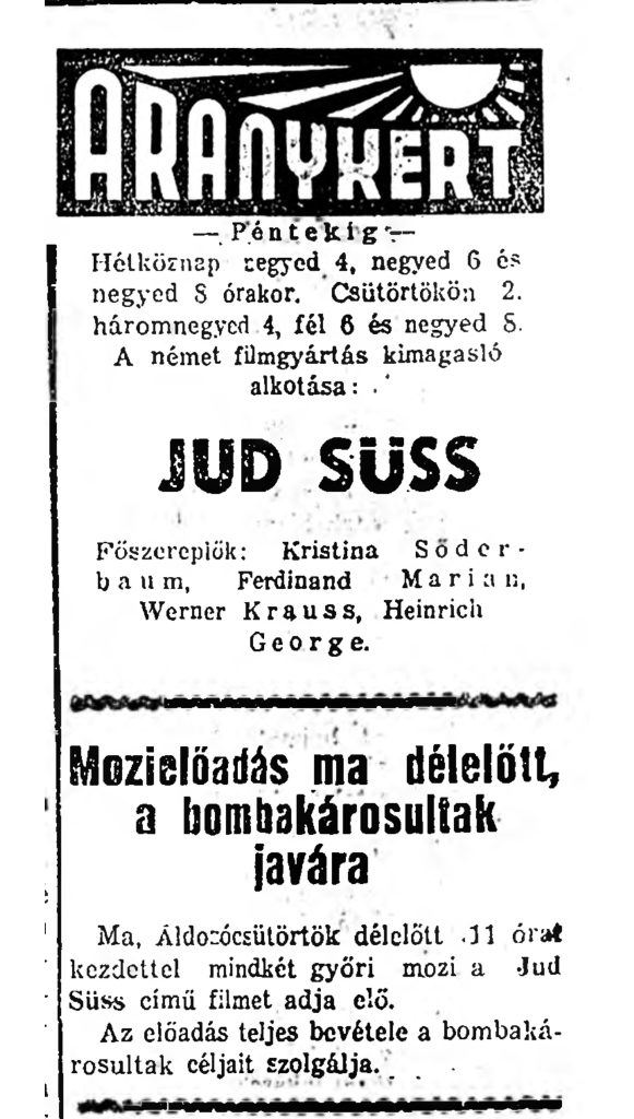 Cikk: A hírhedt német, antiszemita filmet a győri mozikban is játszották. (GyNH: 1944. máj. 18.)