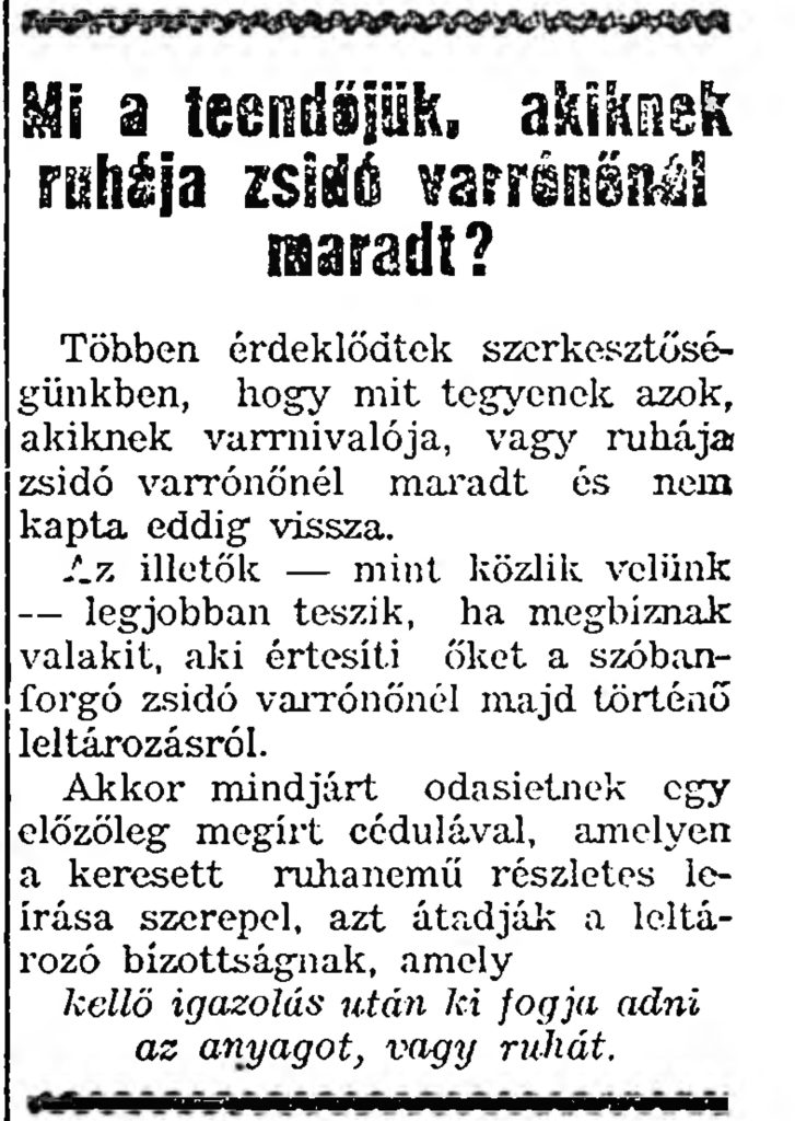 8. „Piszkosak a zsidó lakások…”: Eközben a zsidó lakásokba beköltöztették a bombakárosultakat és más nem zsidókat. „Sorra jönnek szerkesztőségünkbe panaszkodni, hogy általában elhanyagoltak, piszkosak a volt zsidó lakások. Ez úton is felhívjuk a keresztény költözködők figyelmét, hogy minden kiürített lakás az elhagyatottság képét nyújtja, amin egy alapos takarítással lehet segíteni. (…) Ajánlatos lenne minden utcába zsidó munkaszolgálatos takarító csapatot szervezni egy munkafelügyelővel, hogy ezek a csapatok takarítsák ki a zsidók ált piszkosan hagyott lakást, mert a keresztény családoknál ritka ma már a háztartási alkalmazott, viszont a zsidó szemetét méltányos, hogy zsidó takarítsa el.” (GyNH, 1944. máj. 25.)