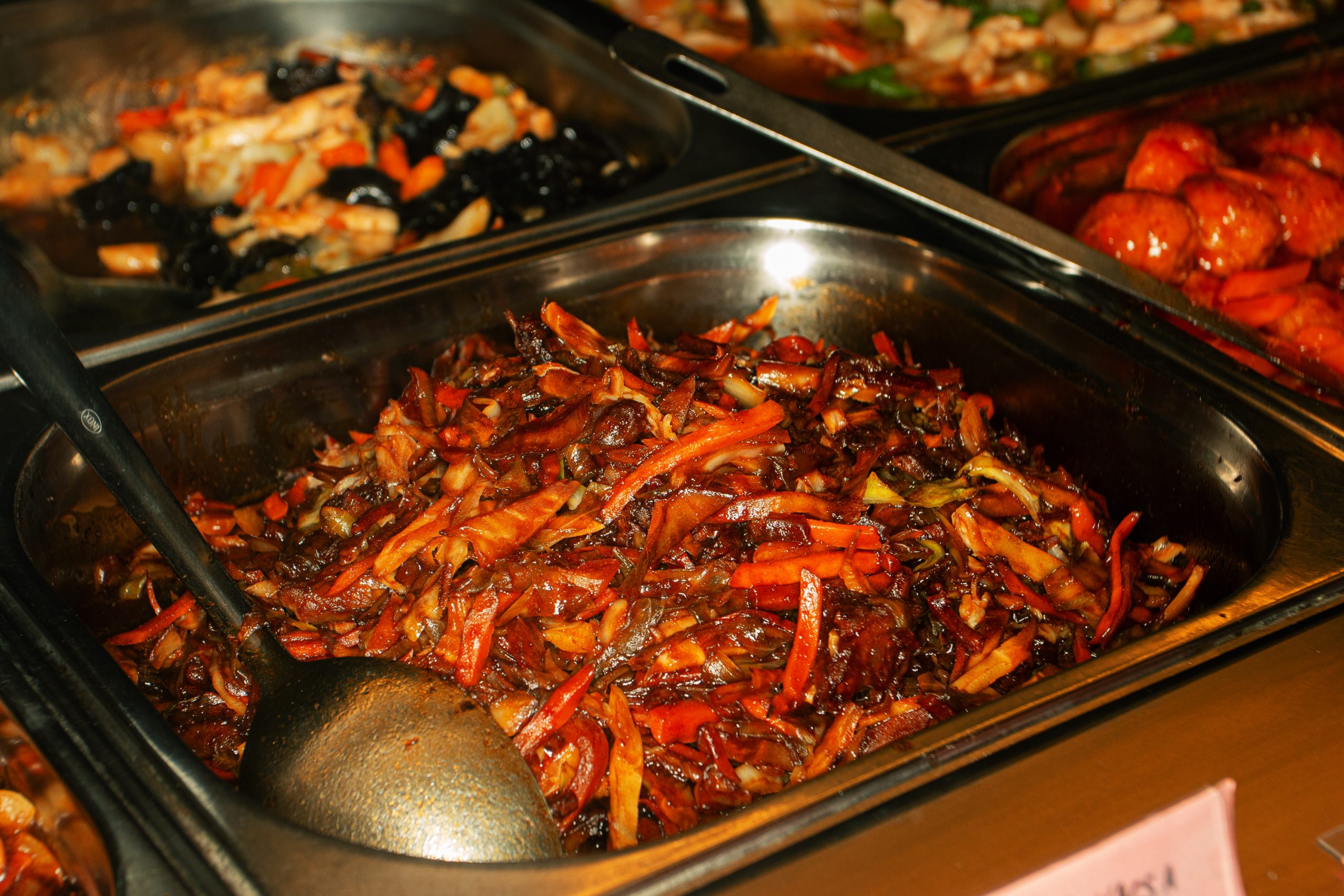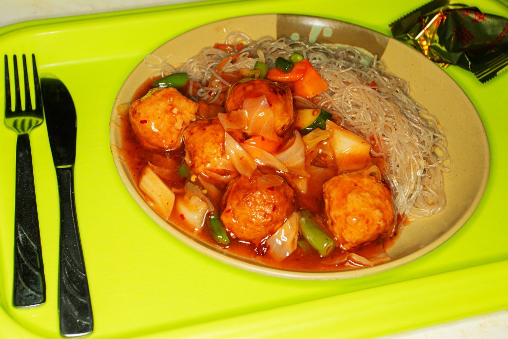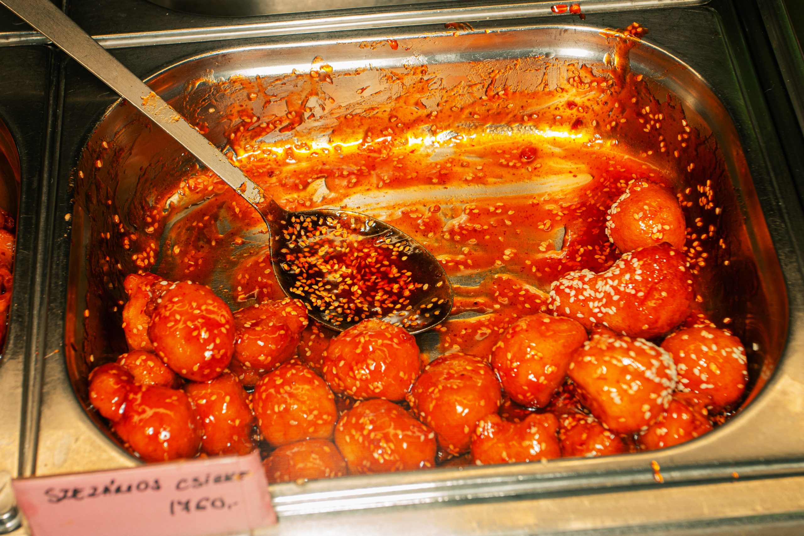 A pult viszont annál inkább hívogató. Fél 1 körül érkeztünk, bőven volt választék, csak dönteni volt nehéz, hogy mit kóstoljunk meg. Az ételek nagy része egyébként nem volt ismeretlen, hasonló kínálattal vár a legtöbb kínai büfé, ami rám újdonságként hatott az a sertéshúsgombóc volt, amit magában, édes-savanyú és szecsuáni szósszal is lehetett kérni (utóbbit meg is kóstoltuk).