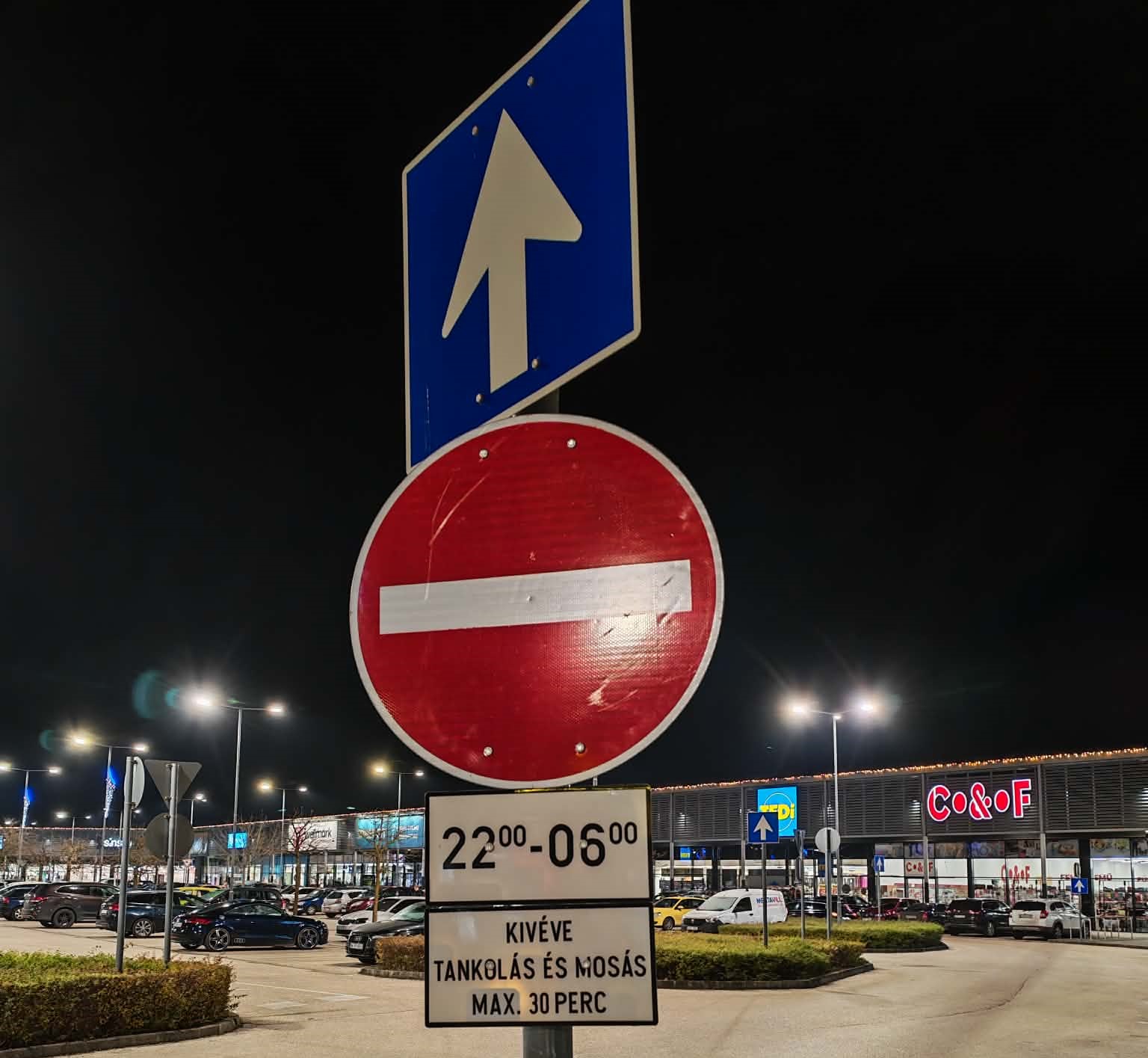 Behajtani tehát tilos 22.00 és 6.00 között, kivéve, ha tankolni vagy autót mosni megy az ember, s akkor is legfeljebb harminc percig lehet bent tartózkodni. A tábla alapján (a mi olvasatunkban) az éjszakai parkolás nem megengedett, illetve nem lehet bent maradni akkor sem, ha 22.00 óra előtt hajtott be valaki.